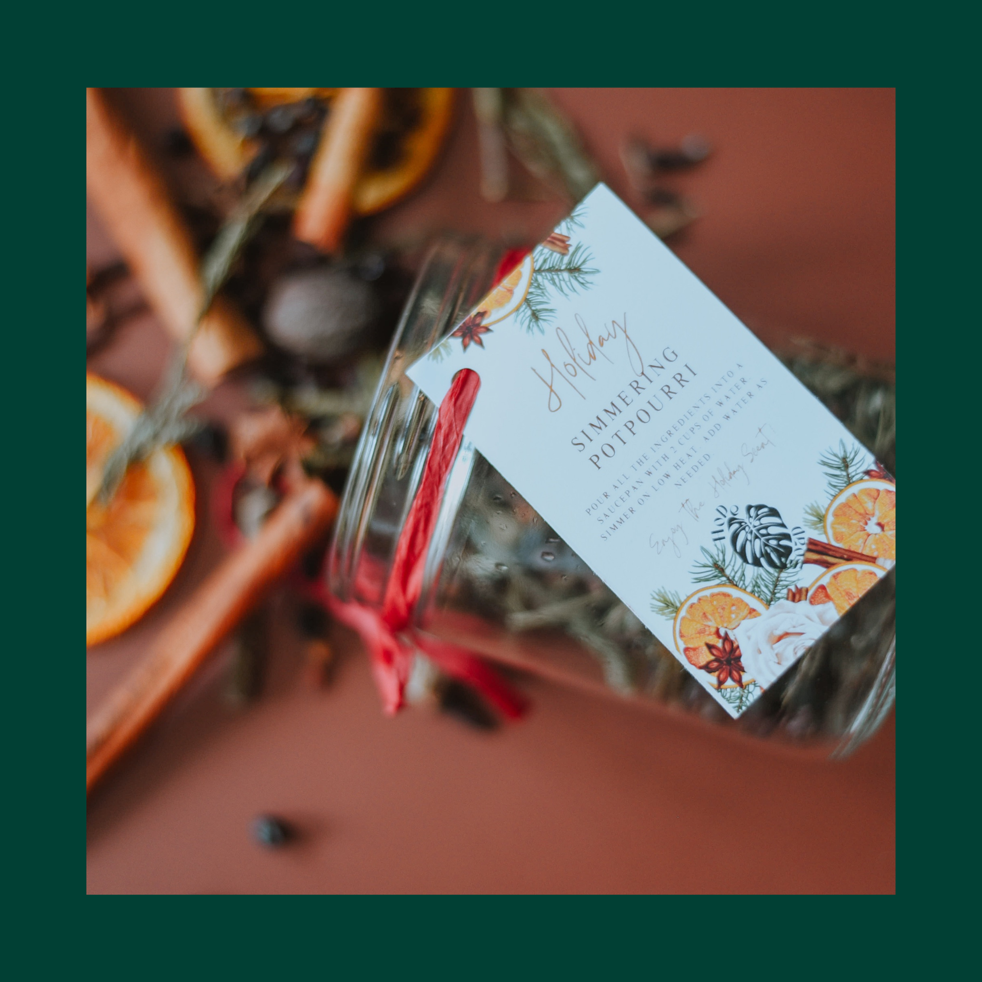 A natural alternative to air fresheners and perfect for setting the cozy mood of the holidays. This simmer pot comes in a 16oz glass jar and includes cranberries, cinnamon sticks, juniper sprigs, orange slices, rosemary, walnuts, cloves, and star anise.